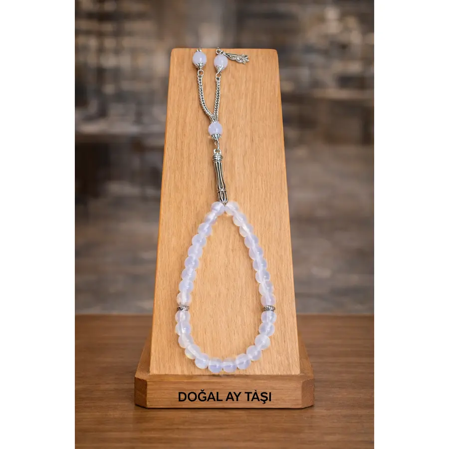 Doğal ay taşından üretilmiş 33'lü tesbih. Sedefimsi parıltısıyla şık ve özel bir aksesuar.