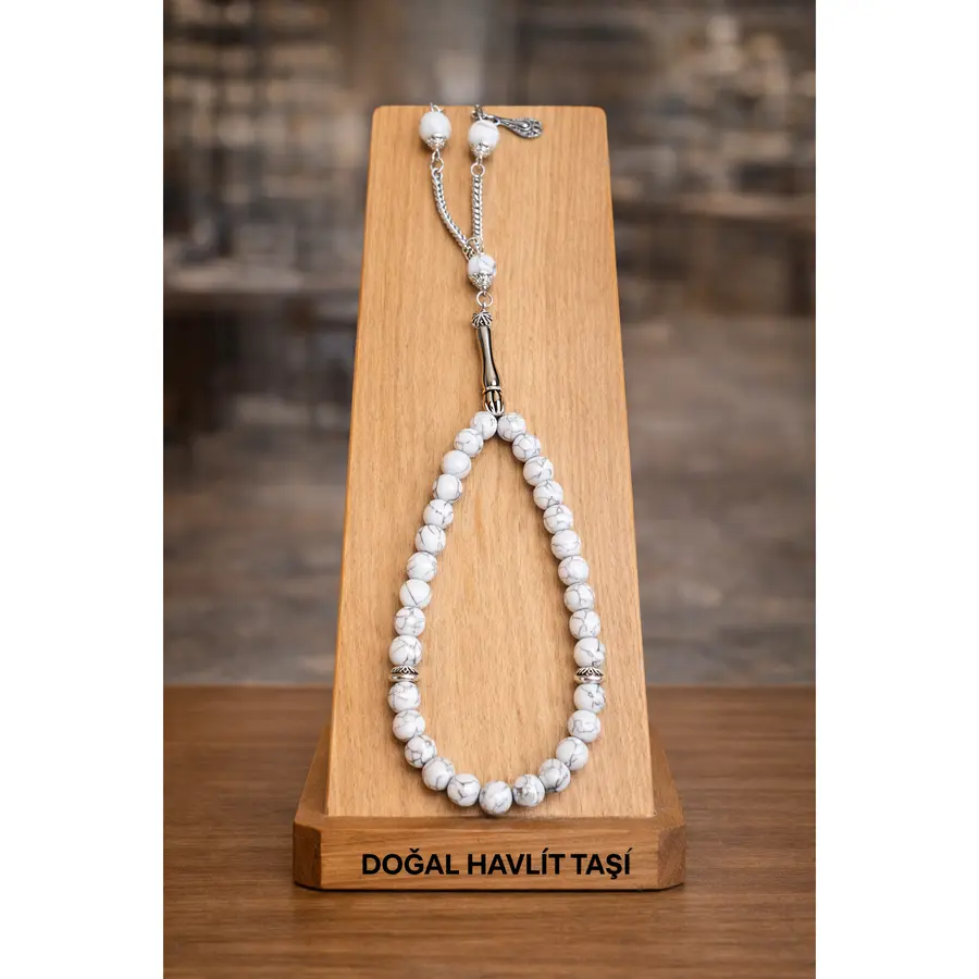 Doğal havlit (howlite) taşından üretilen bu tesbih, doğal beyaz-gri damarlanmasıyla göz alıcı bir görünüme sahiptir. 33 boncuklu klasik tesbih formatında sunulmaktadır.
