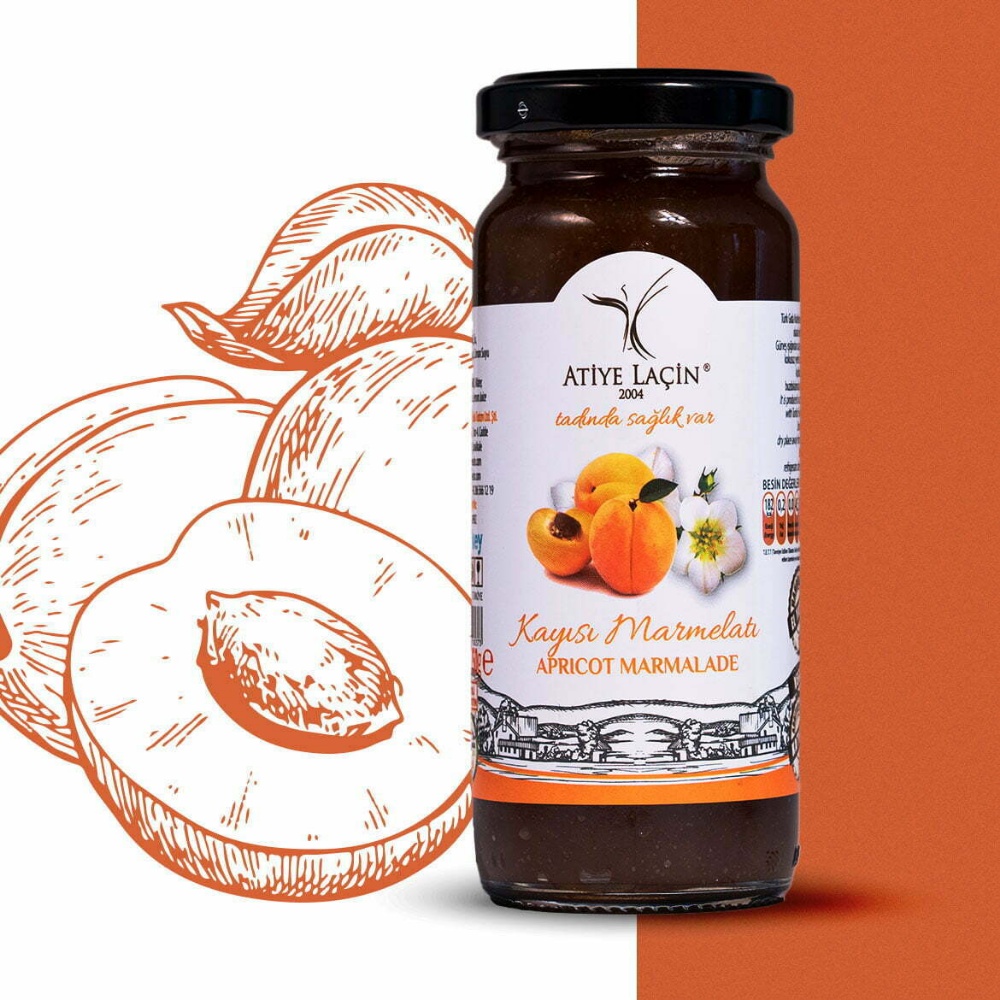 Atiye Laçin Kayısı Marmelatı, doğal kayısılardan hazırlanan lezzetli bir kahvaltı ürünüdür.