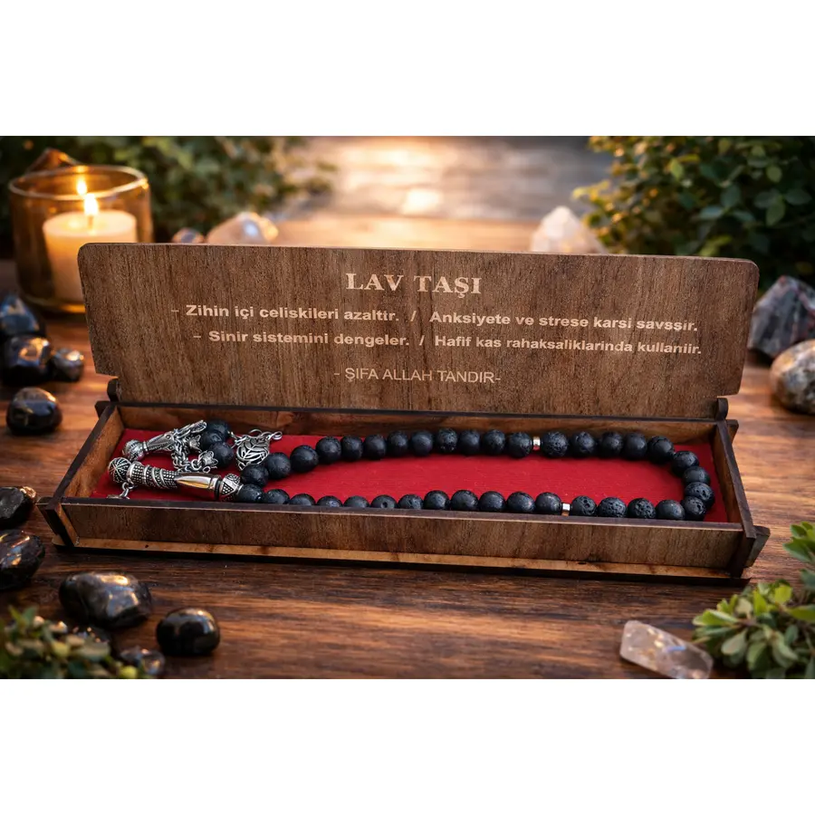 Doğal lav taşından üretilmiş 33'lü tesbih, özel sunum kutusunda. Gözenekli yapısı ve mat siyah rengiyle dikkat çeken lav taşı aynı zamanda eterik yağlar için doğal bir difuzör olarak da kullanılabilir.