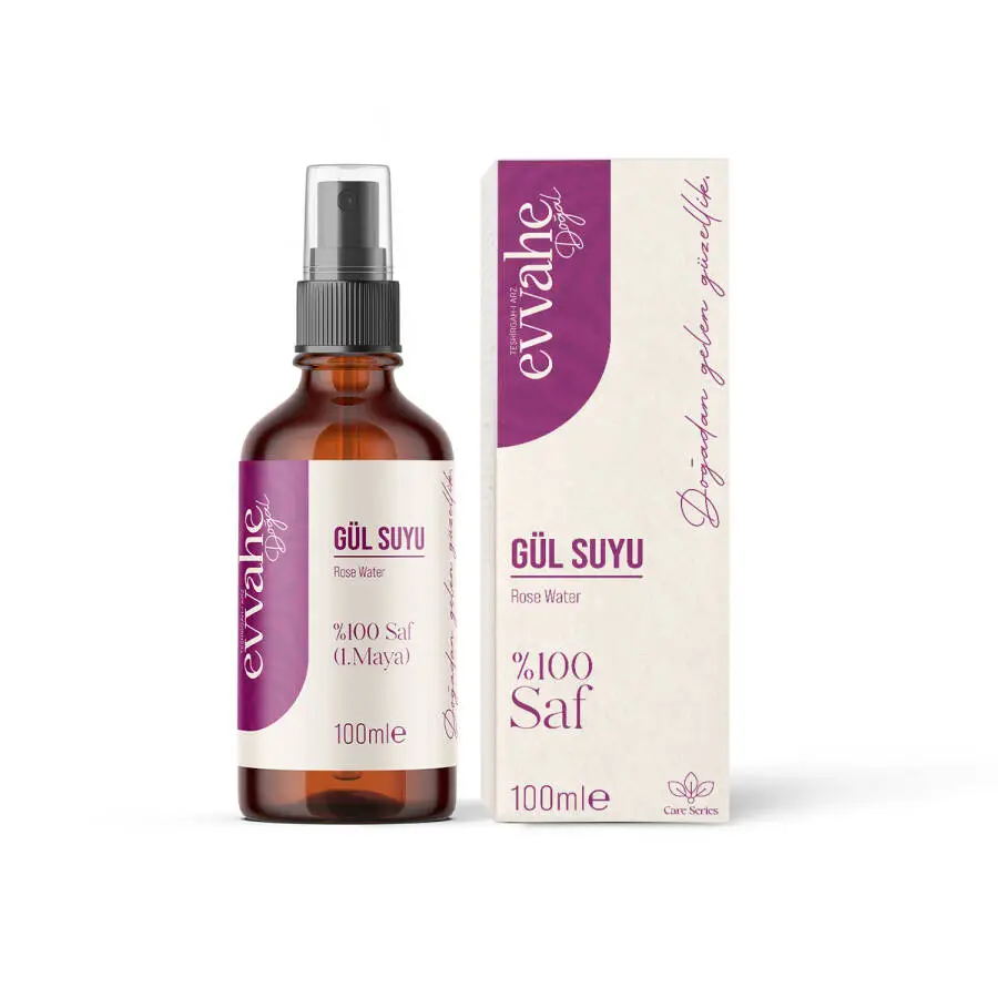 Evvahe markasının %100 saf gül suyu. Cilt temizleyici, tonik ve nemlendirici olarak kullanılabilir. Doğal gül yağı içeriği ile cildinizi besler ve tazelenir.