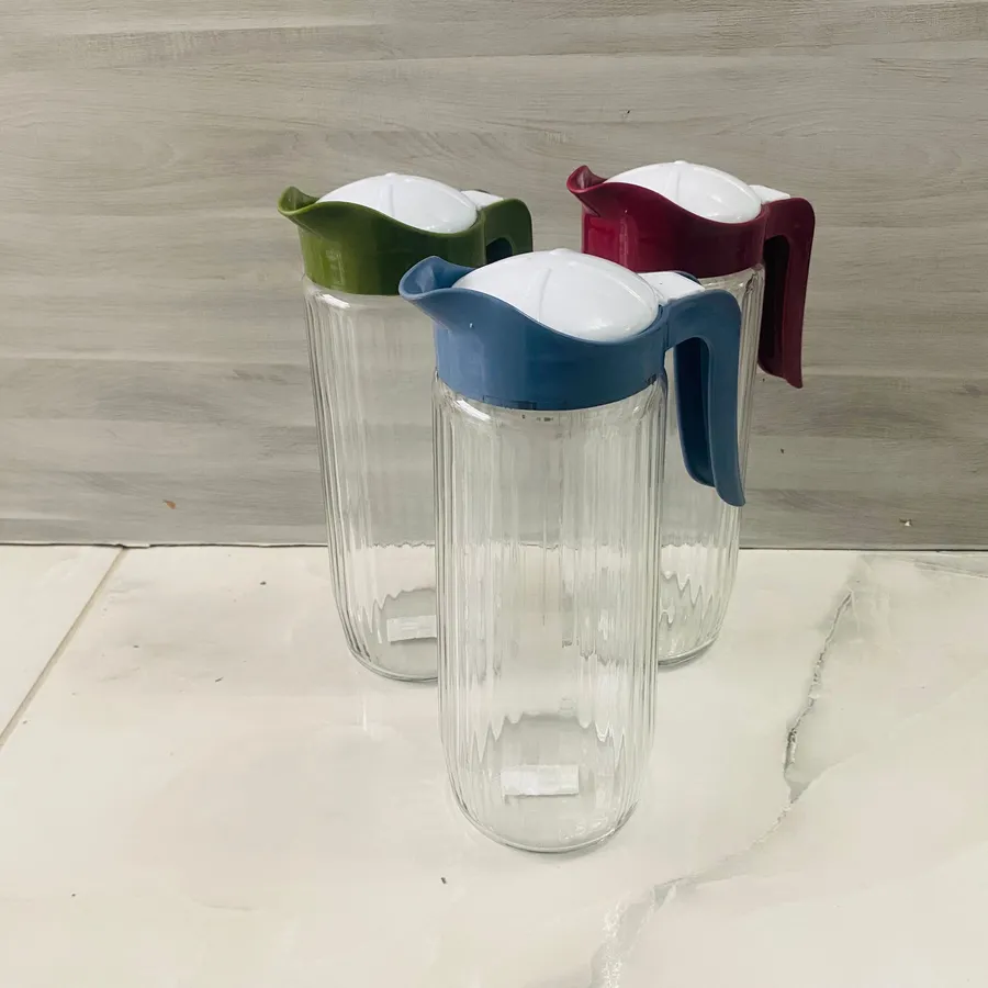 Dayanıklı cam sürahi. 1,5 Lt kapasiteli, farklı renk kapak seçenekleri ile gönderilebilir.