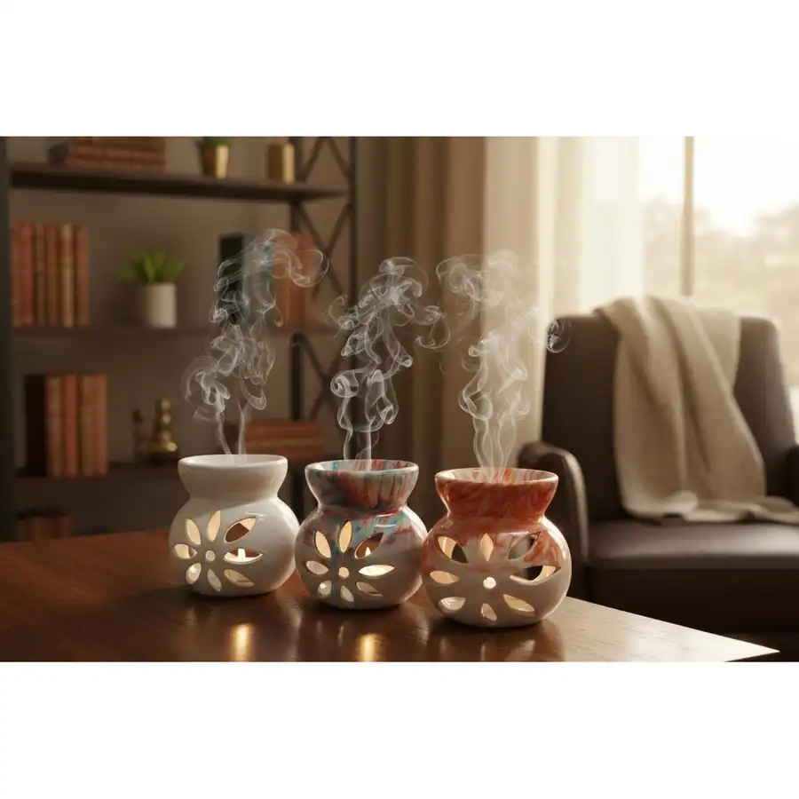 Lotus çiçeği desenli seramik buhurdanlık, hem dekoratif hem de fonksiyonel kullanım için ideal. Esansiyel yağlarınızı en etkili şekilde kullanmanıza olanak tanır.