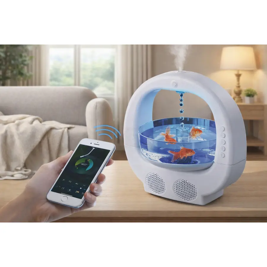 Anti-gravite su damlası efekti ve akvaryum tasarımıyla öne çıkan, renkli ortam aydınlatması sunan Bluetooth hoparlörlü difüzör.