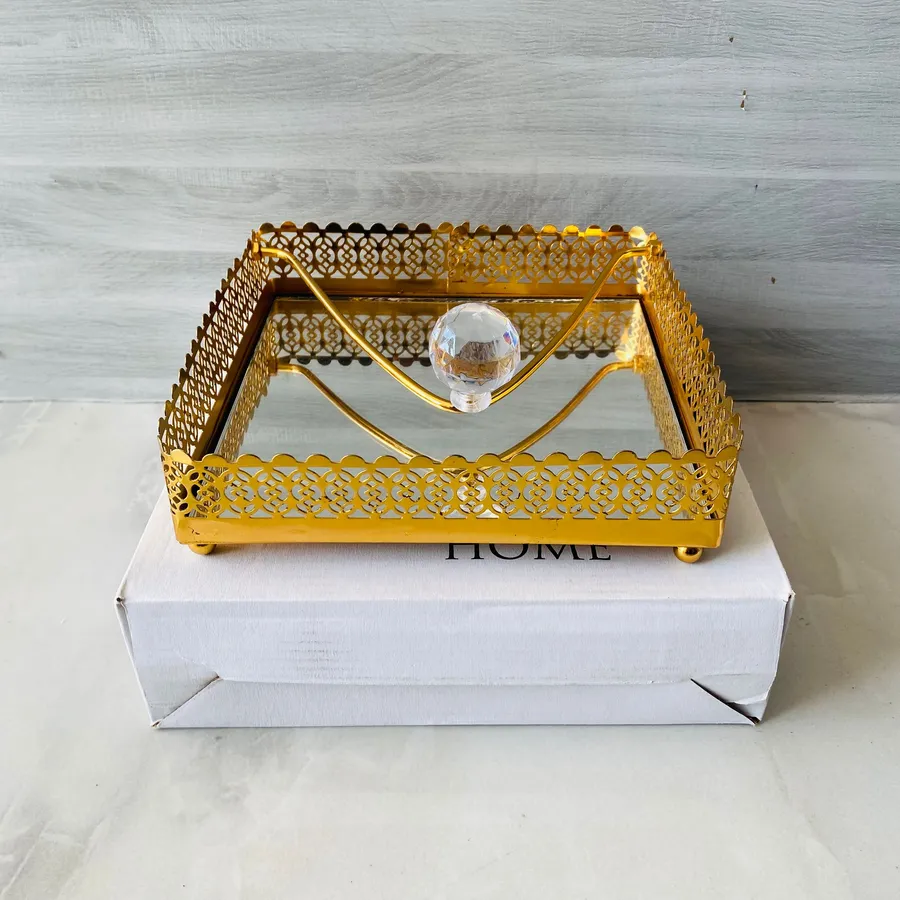 Monor Home aynalı peçetelik gold renk. Şık tasarımı ile sofra dekorasyonuna zarif bir dokunuş katar.