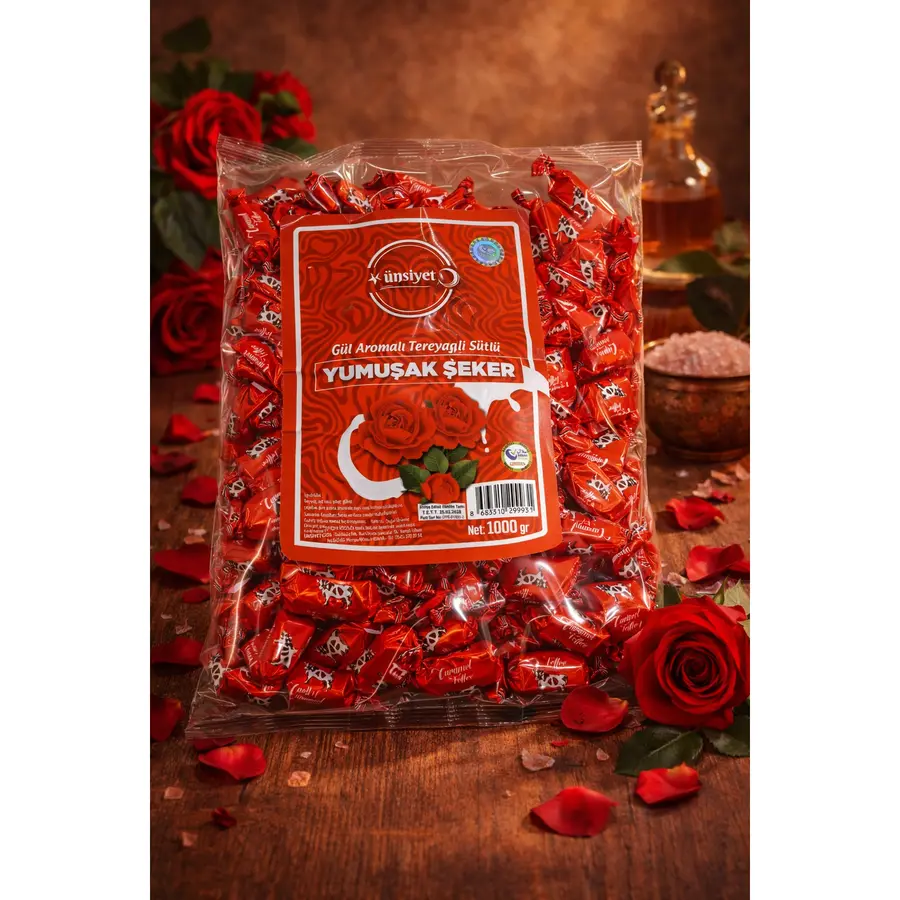 Gül aromasının zarif kokusunu tereyağı ve süt ile harmanlayan bu yumuşak şeker, 1 Kg ekonomik ambalajıyla ikramlık ve hediye için mükemmeldir.