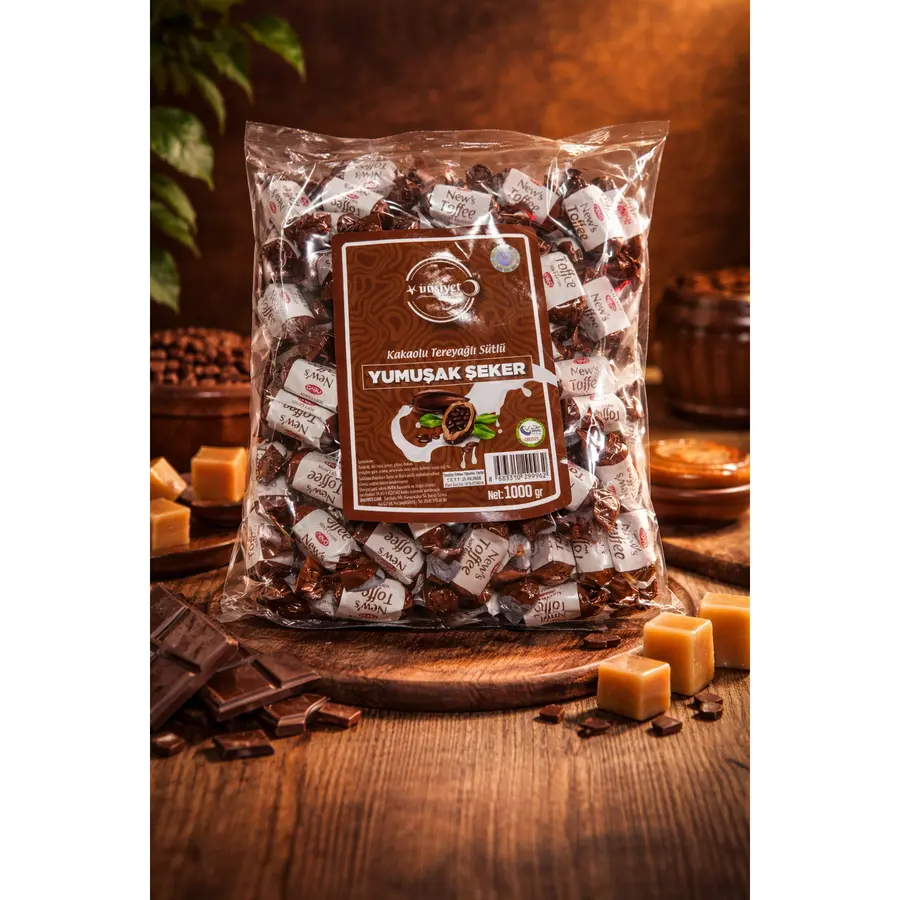 Kakao aromasının zengin lezzetiyle tereyağı ve sütü bir araya getiren bu yumuşak şeker, çikolata sevenler için vazgeçilmez bir ikramlık alternatifidir.
