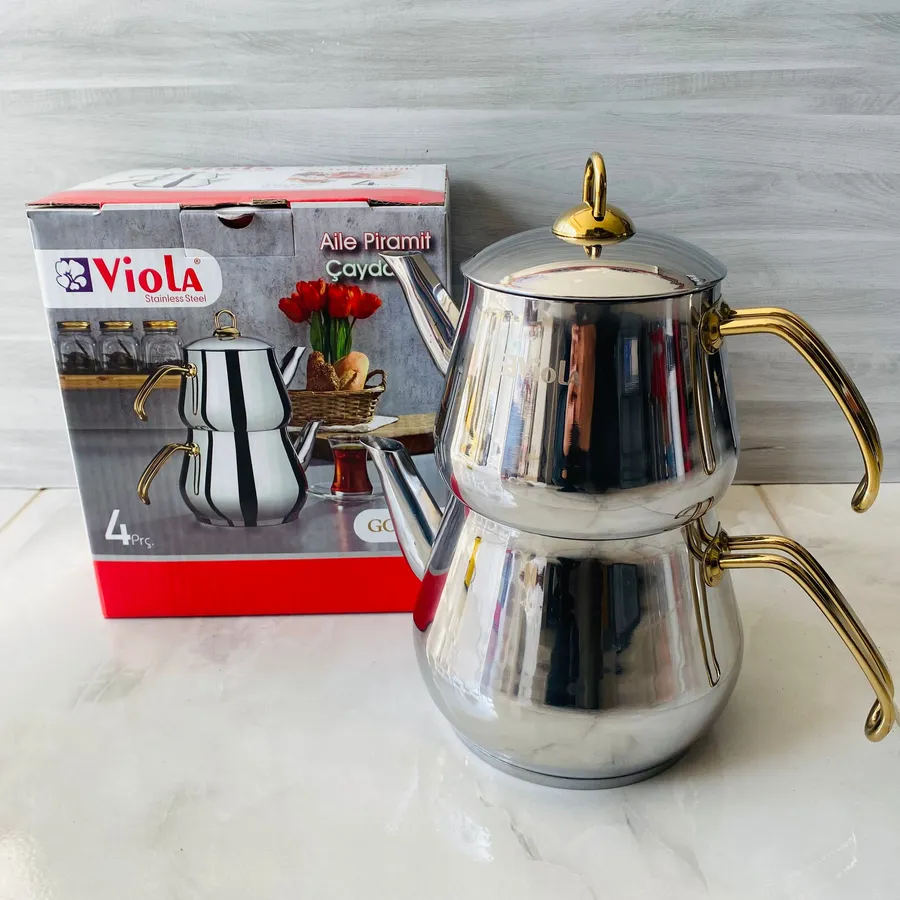 Viola aile boyu piramit çaydanlık set, gold renkli kulpları ile şık tasarım. 27 bardak kapasiteli, kalabalık aileler için ideal.