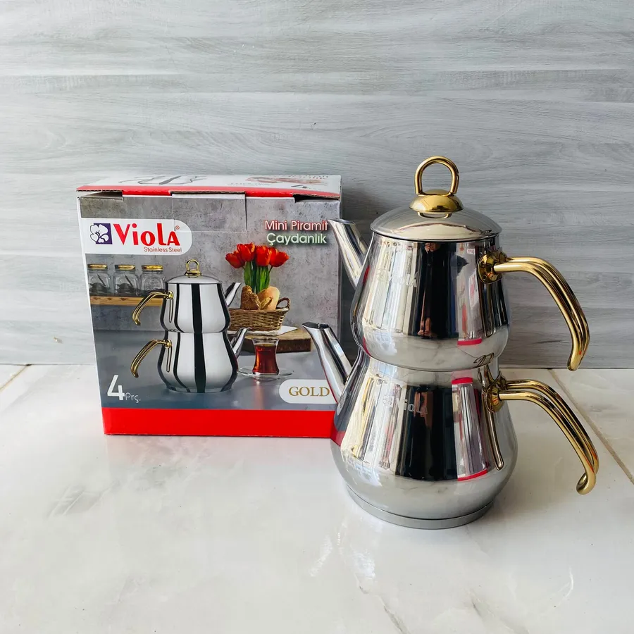 Viola mini piramit çaydanlık set, gold renkli kulpları ile şık tasarım. 12 bardak kapasiteli, küçük aileler için ideal.