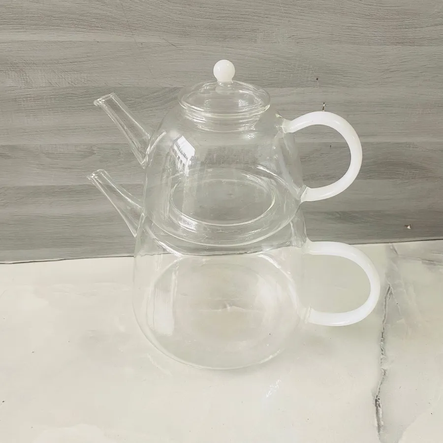 Dayanıklı cam gövdeli çaydanlık. 2,3 Lt kapasiteli (0,5 Lt demlik + 1,8 Lt şişe). Isıya dayanıklı borosilikat cam.
