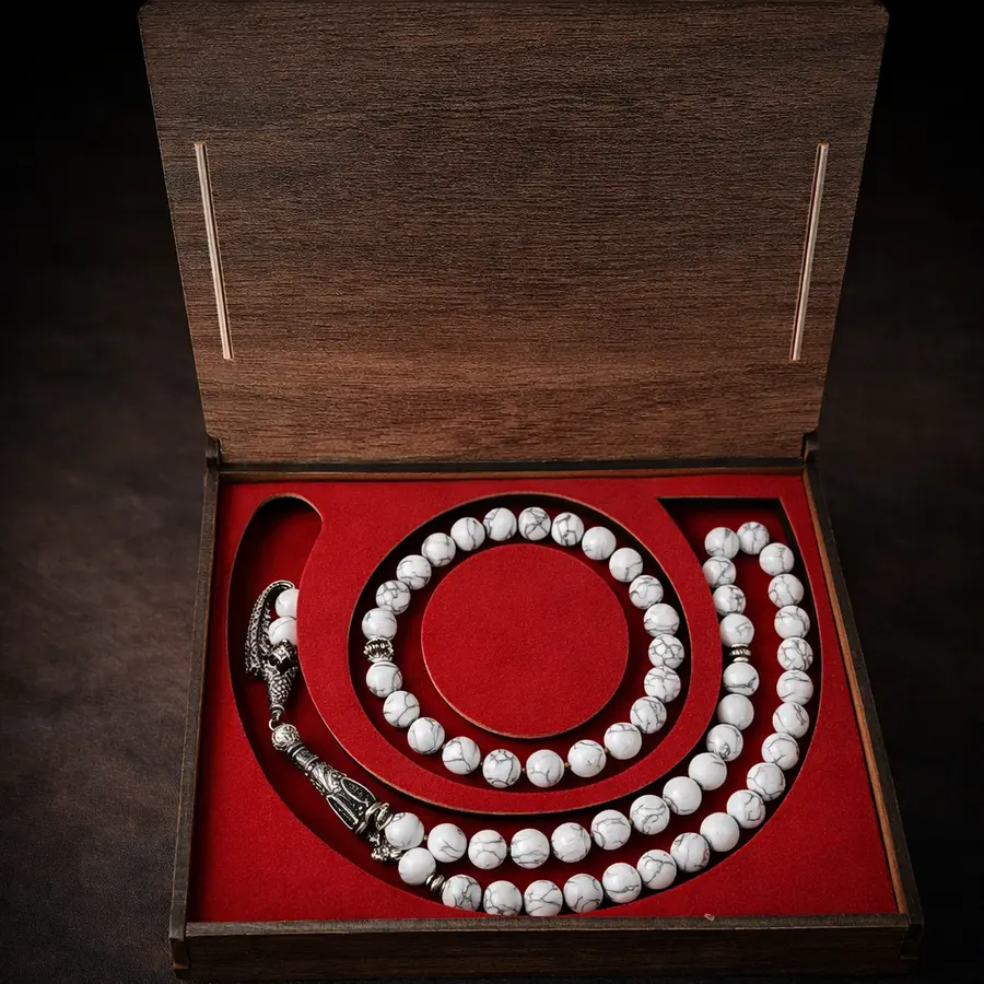 Beyaz havlit taşından üretilmiş tesbih ve bileklik seti. Ahşap sunum kutusunda sunulan bu set, hediye için mükemmel bir seçenektir. Havlit taşının karakteristik beyaz rengi ve gri damarlanması şık bir görünüm sağlar.