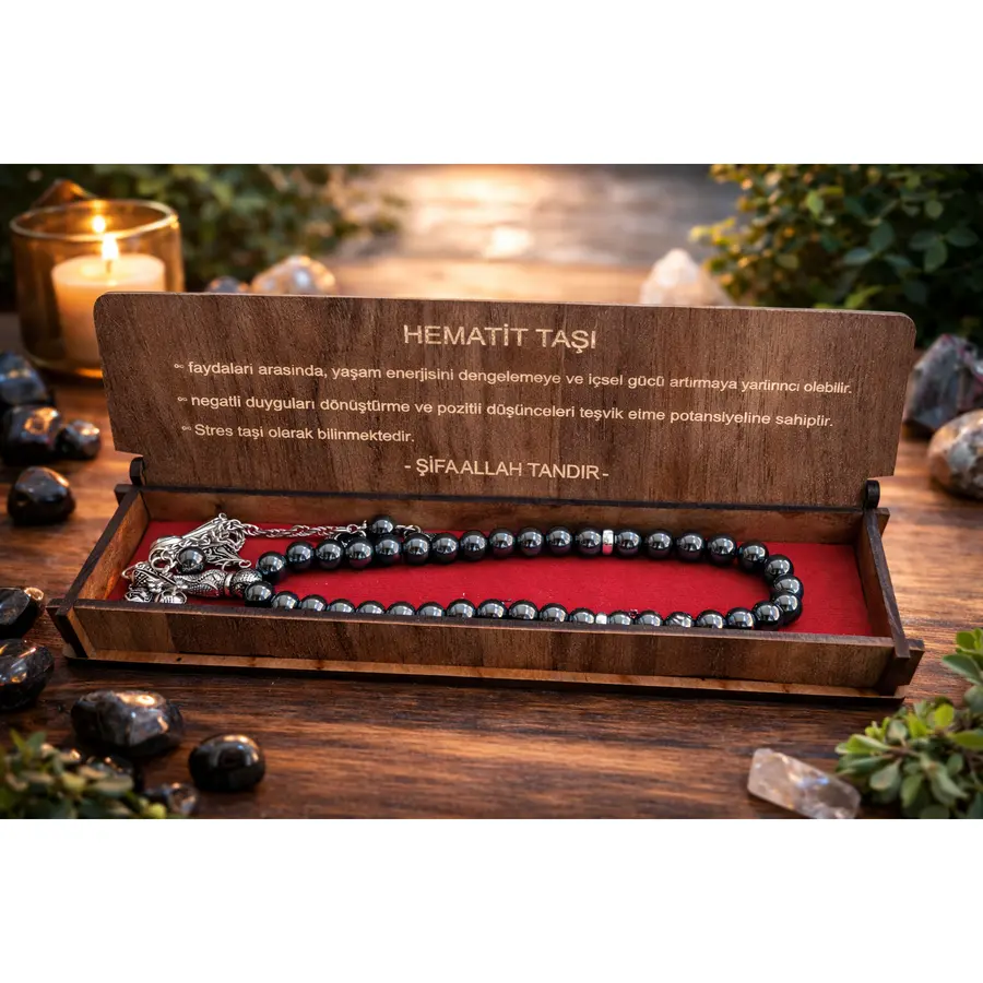 Doğal hematit taşından üretilmiş 33'lü tesbih, özel sunum kutusunda. Hematit taşının metalik siyah parıltısı şık ve maskulen bir görünüm sunar.