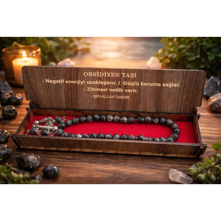 Doğal obsidyen taşından üretilmiş 33'lü tesbih, özel sunum kutusunda sunulmaktadır. Obsidyen taşının derin siyah rengi ve cam benzeri parlaklığı etkileyici bir görünüm sağlar.