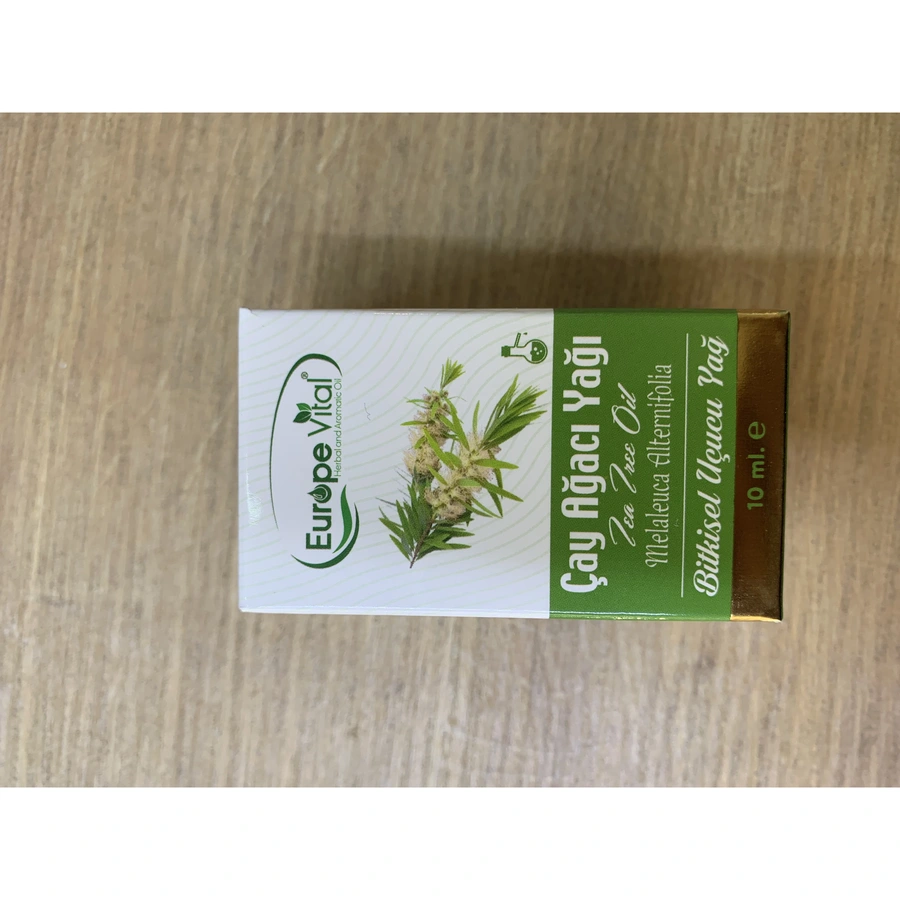 Europe Vital markasının %100 doğal çay ağacı yağı, 10 ml şişe ambalajda. Antiseptik özellikleri ile doğal bakım ürünü.