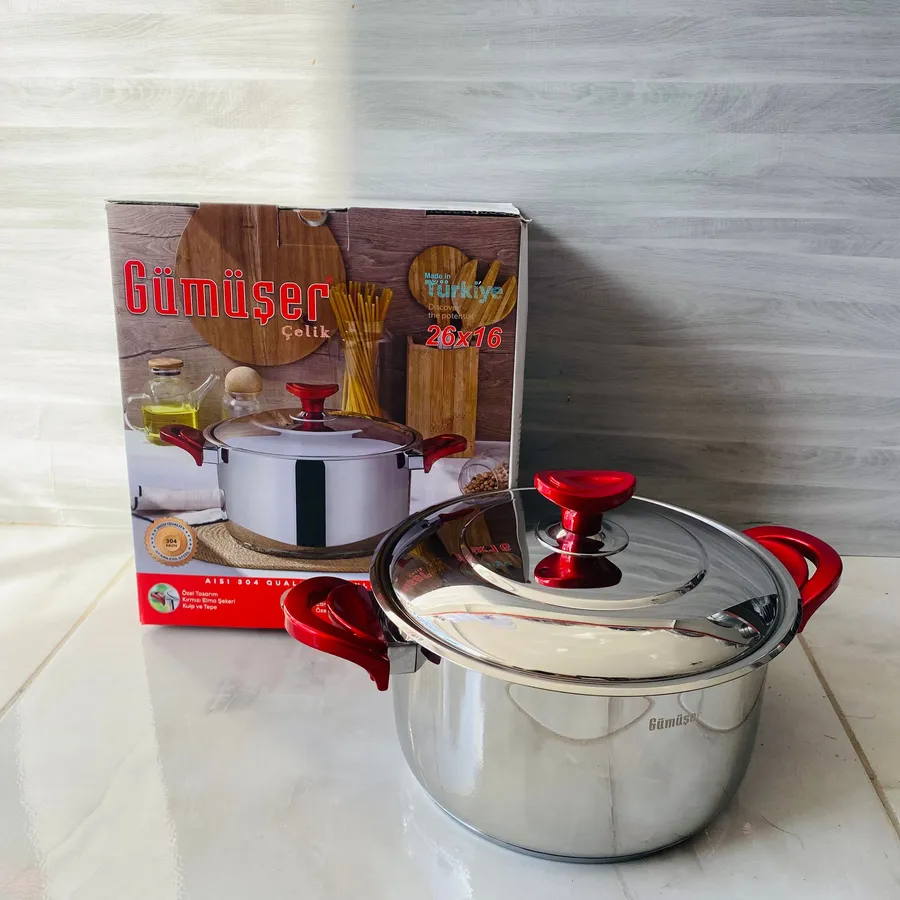 Gümüşer 26 cm çelik derin tencere. Çap: 26 cm, Derinlik: 16 cm. Aile boyu pişirmeler için ideal boyut.